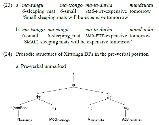 Bantu languages generally allow variable word order in the DP in the post-nominal position (Rugemalira 2007). However, besides this flexibility, there are variations in the grammatical orders of DP modifiers in pre-nominal positions in Southern Bantu languages. These variations have received no detailed attention in the literature, even though they have been noted in recent work on a number of Southern Bantu languages (Letsholo and Matlhaku 2014 and Creissels 2016 for Setswana, Guthrie code S31; Mokoaleli, Riedel and Furumoto forthcoming for Sesotho, Guthrie code S33; de Dreu 2008 for Zulu2, Guthrie code S42). Xitsonga allows pre-nominal demonstratives, numerals, and adjectives. In fact, Xitsonga allows the ordering of DP-internal modifiers in every logically possible order, including with multiple modifiers. However, here we will focus on DPs that include a noun and only one modifier, as this is how our experimental data was collected (but see Riedel and Lee 2021 for a discussion of complex DPs and their prosody). As has been noted for other Bantu languages which allow this pre-nominal nominal modifier placement, including Zulu (de Dreu 2008), two varieties of Makonde (Guthrie code P23; Devos 2004, Kraal 2005), and Setswana (Letsholo and Matlhaku 2014), the marked word order is associated with focus effects in Xitsonga. In this paper, we show that in Xitsonga the pre-nominal element is prosodically marked with a longer duration of PL when compared to post-nominal elements in non-sentence-final position.