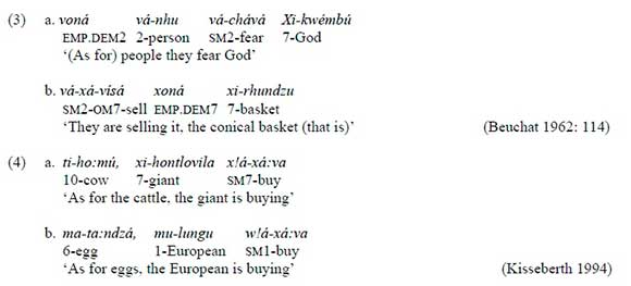 The focus effect of the pre-nominal order has also been noted for demonstratives in Xitsonga (Beuchat 1962; see examples 3a and b below), as were PL effects in pre-verbal and final positions (4).
