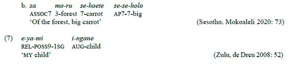 2 In Zulu, pre-nominal modifiers are relativised and morphologically marked with a so-called "relative prefix" (for discussion, cf. de Dreu 2008). This is not the case in Xitsonga, so the data might not be comparable across all Southern Bantu languages.