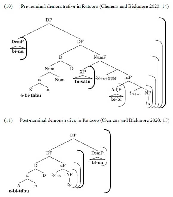Clemens and Bickmore (2020) largely follow Carstens (2008) in their analysis of the DP structure in Rutooro (Guthrie code JE12), shown in (10). However, Clemens and Bickmore assume that the demonstrative is base-generated as an adjunct to DP, rather than moving there, and that this can happen on the left (10) or the right (11), leading to demonstrative-initial or demonstrative-final word orders.4Clemens and Bickmore (2020) also show that Rutooro has a different prosodic phrasing pattern and different syntactic properties for demonstratives and the agreeing quantifier meaning 'all' (but not other quantifiers or numerals), which can appear pre-nominally, unlike other nominal modifiers.