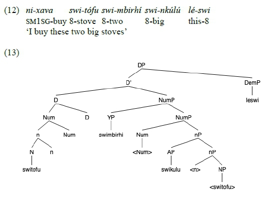 Following Clemens and Bickmore (2020), but treating the demonstrative (DemP) as a specifier, we assume that a Xitsonga DP, where the modifiers appear in the unmarked order like the one in (12), has the structure in (13).6