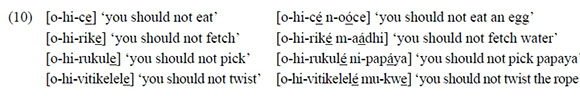 8 Patin (2007: 167) offers an example that supports this claim, similar in nature to (6) above: ŋɡamwono mnɖu hulimo Ί see a person who cultivates' (slightly modified). However, recordings are unavailable for the purposes of verifying the data.