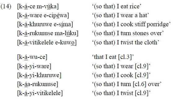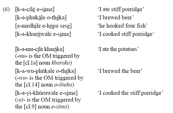 5 Abbreviations: aug = augment; fut = future; hyp = hypothetical; neu = neutral; om = object marker; pas = passive; pfv = perfective; pl = plural; rel = relative; sg = singular. Numbers refer to classes.