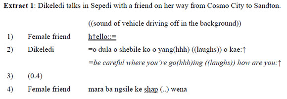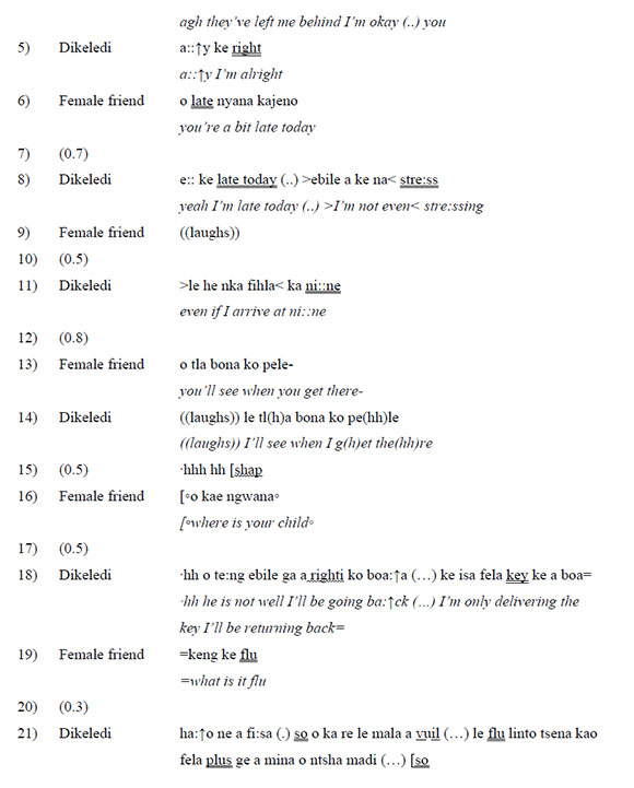 Temporally, this extract straddles the telling of an account in the past (see De Fina 2009a), to the narrating of unfolding events in the present, to a jointly constructed projection of events in the near future. Very similarly to Extract 4, Dikeledi is talking about her acts as she accomplishes them. The transient, temporally and spatially contingent nature of the contact between Dikeledi and her friend also reflect the linguistic means that the two friends adopt in their roles as interlocutor. The exchange is generally exclamative, consisting of a hailing and interpellation of one's interlocutor. Shap a deformation of sharp, a fairly usual South African slang term that has been translated as okay, is repeated, and combines with exclamations as to the heat (chesa turn 22), lateness and stress. Use of linguistic repertoire is fairly marked in this extract with English derived language alternation creating a discourse oriented (Auer 1984) lexical field that pertains to work (late, stress, nine, key, early, cause, then ...).