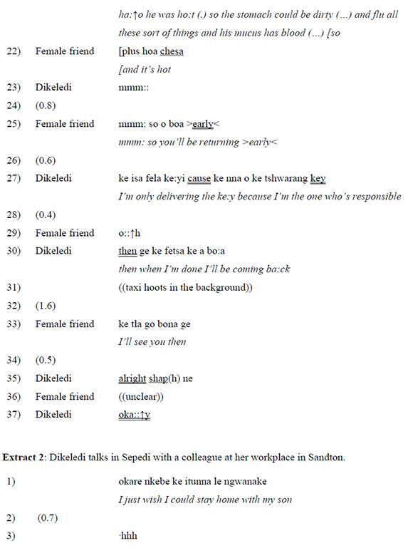 Small stories from the interstices function with situated and interlocutor-oriented deixis, overlapping of diagetic story world and storytelling world and complex temporal structures. To illustrate this, Extract 1 below gives a transcript of a recording made by Dikeledi on her way to work in the interstitial space of a taxi stop, whilst Extract 2, recorded two days later with her colleague, gives the same subject matter, her sick son, this time in her workspace. As in all the transcripts given here that are of 'Gauteng' varieties of Setswana, Sepedi and isiZulu (Lafon 2005) very informal and contact forms are underlined with a wavy line, English derived forms are double underlined and Afrikaans derived forms are underlined with dashes. Translations are given in italics below each turn. Transcriptions indicate pauses (...), vowel elongation (:::), emphasis (bolding and capitalisation), changes in intonation (fj), changes in speed (><) and breathiness (-hhh). They follow the schedule given in De Fina and Georgakopoulou (2015:7).