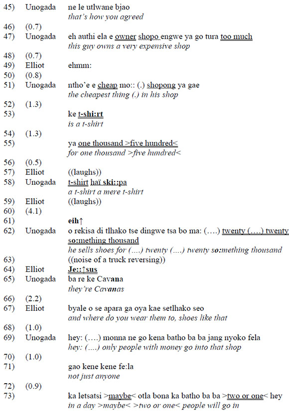 Extract 3 gives the interchange between Elliot, a personal assistant for an overseas investment bank, and a car guard who, following the custom in the Gauteng, has been called 'Unogada'. In South Africa, car guards are mainly unemployed men who look after parked cars, and sometimes wash them, in exchange for a few Rands (the South African currency). In this case Elliot is waiting in a service alley behind a Virgin Active Gym and chatting to Unogada to pass the time. The extract given here tells about two people: Mr Motsepe, a South African mining magnate who is also known for his philanthropy and closeness to the governing ANC, and a shop owner in the Sandton City Mall who used to pay Unogada weekly.