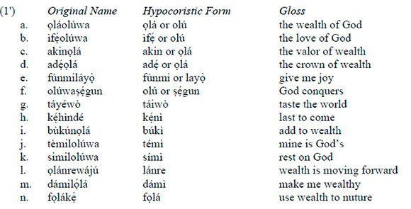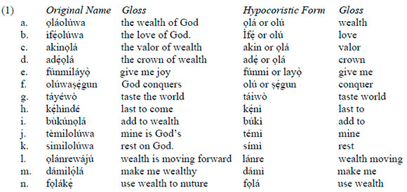 In terms of structure, hypocoristic names may be formed by shortening (Ola 1995) or reduplication (Orie 2002). In some other cases, the tonal pattern may be modified to realize a different tonal pattern in the derived hypocoristic name. For personal names in Yoruba, the following hypocoristic names in (1) are formed through shortening.