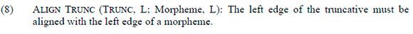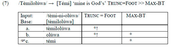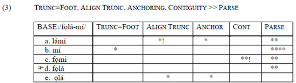 Ola (1995) explains that, even though candidate (3a) satisfies Trunc=Foot, it is still sub-optimal because it violates Align Trunc and Anchor. This candidate lámí (3a) violates Align Trunc since its left edge does not align with the left edge of the morpheme in the base (folámí). Also, while Anchor requires corespondence at the initial and final segments of the base (right and left edges), candidate (3a) lámí only corresponds with the final segment from the base (folá-mi). Hence, it is not anchored at the initial segment, and therefore fails to satisfy Anchor. Candidate (3b) - a monosyllabic word - is ruled out by violating Trunc=Foot, while candidate (3c) fails by violating Cont; the truncated form in (3c) does not constitute a contiguous string from the base. Hence, the last candidate (3d) wins by not violating any higher-ranked constraints and is not fatally penalized for violating Parse, which is lower-ranked. It violates Parse because the final syllable [mi] of the base is not realized in the truncated form.