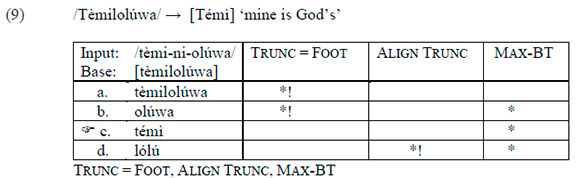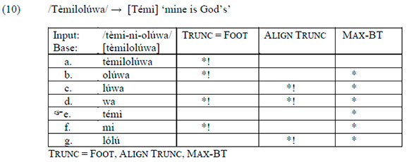 Essentially, candidate (9d) lolú is ruled out by Align Trunc since it does not align with the left edge of the morpheme (i.e tèmi or olúwa). Although both candidates (9a) and (9b) do not violate Align Trunc, they are ruled out by Trunc=Foot, as previously explained. However, note that there is no ranking argument in the constraint hierarchy. in other words, if the ranking of constraints is reversed, candidate (9c) would still be the winning candidate. A fuller analysis is provided in (10), including a variety of other possible candidates for the hypocoristic form of the name Tèmilolúwa.