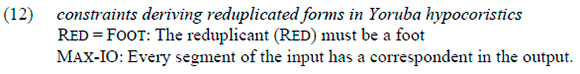 Essentially, in deriving optimal hypocoristic names in Yoruba, there is a significant interaction between the process of reduplication, prosodic categories (foot) and tone. While a hypocoristic name may be formed by reduplication, high ranked constraints such as Red = Foot and Align Red Hypo-T impose prosodic and tonal constraints on the output form.
