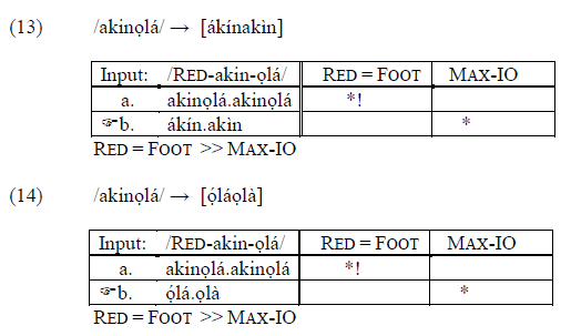 In the tableau in (19), candidate (19c) ákín.akinolá fails to satisfy Max-BR. In the form [ákín.akinolá], the base -akinolá does not correspond with the reduplicant -ákín. But in candidate (19b), the base -ákín corresponds with the reduplicant -akin. Note that they both satisfy Red = Foot since the reduplicant in both candidates (19b,c) conform to a foot. However, (19b) ákín.akin wins by satisfying higher ranked Max-BR which ákín.akinolá fails to satisfy. Crucially, Max-BR needs to be ranked higher than Max-IO to produce the winning candidate. Hence, the ranking of the reduplicative identity constraints over input-output faithfulness constraints is what makes the reduplicant more identical to the base than the input segments in reduplication.