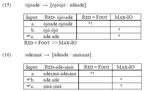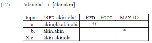 In tableaux (13) and (14), the candidate (13a, 14a) akinolá.akinolá is ruled out by Red = Foot since the reduplicant (RED) is more than a foot. However, (13b) akin.akin and (14b) álá.olà are optimal forms by having a reduplicant that is a foot. Though (13b) akin.akin and (14b) álá.olà violate Max-IO, since segments in the input are deleted in the output, they still win because Max-IO is low ranked. Crucially, these indicate that Red = Foot need to outrank Max-IO in the constraint hierarchy to produce an optimal reduplicated form. To further buttress the ranking of Red = Foot above Max-IO, analysis of hypocoristic forms of names such as òjóadé and adésínà are presented in tablueax (15) and (16).