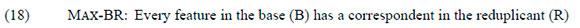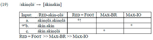 This constraint ensures that there is correspondence between the base and the reduplicant. In other words, it militates against deletion of segments in the reduplicant. Thus, while Max-IO may not be able to rule out ákín.akinolá, Max-BR would rule it out, as shown in the tableau in (19).
