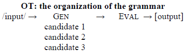 As McCarthy (2007:4) explains OT sets up a basic dichotomy between the operational component of the grammar and the constraint component. The operational component, called GEN, constructs a set of candidate output forms that deviate from the input in various ways. The constraint component, called EVAL, selects a member of this set to be the actual output of the grammar. In other words, a set of candidates is obtained from GEN, evaluated by EVAL using a constraint hierarchy, and the candidate that violates top-ranked constraints less frequently is chosen as the grammar's output.