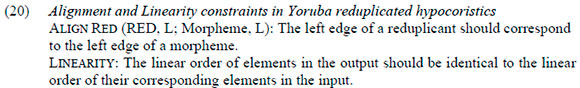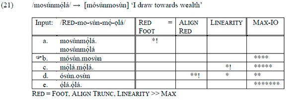 It should be noted that the constraint Linearity is different from Align Red in the sense that, while the latter aligns the reduplicant to the left edge of the morpheme, the former requires that the reduplicant conform to the linear order in the input. Thus, in tableau (21), candidate (21c) mçlá.mçlá does not violate Align Red since its left edge aligns to the left edge of a morpheme (i.e mó). However, it violates Linearity since the entire word mólá.mólá does not preserve the linear order - [mó-olá] - in the input. This is because the second back vowel in the input [mó -olá] is deleted in the derived output [mó-lá], which deviates from the input linear order [mó-olà], showing a sequence of vowels at mopheme boundary. While the candidate ósún.osün does not violate Linearity, it fatally violates Align Red since its left edge deviates from the left edge of a morpheme in the input. Candidate (21e) çlá.çlá satisfies all high ranked constraints (just like the winning candidate - [21b] mósún.mosün), but incurs more violations of Max-IO. The winning candidate is (21b) mósún.mosün since it is the most harmonic with the constraint hierarchy.
