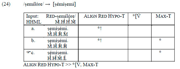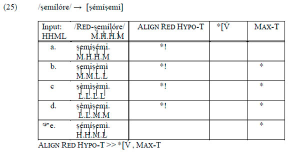 As in tableau (24), the nonoptimal candidates (25a-d) are ruled out by violating the constraint Align Red Hypo-T. Thus, candidate (25e) is the winner since it does not violate this high-ranked constraint in the derived hypocoristic. Both tableaux in (24) and (25) show that there is a critical ranking of constraints in producing the optimal candidate. That is, if the constraint ranking is flipped the other way, the tonally faithful candidate (25a) semísémi, which is not the tonally optimal hypocoristic, will be considered the winner. The faithful candidate incurs fewer violations of constraints but is disqualified by not satisfying a higher-ranked tonal constraint in the hypocoristic.