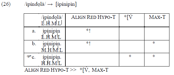 Note that candidates (26a) and (26b) do not violate *[V since they are vowel-initial words starting with a low (L) and Mid (M) tone respectively. The third candidate (26c), on the other hand, starts with a high tone which is disallowed in vowel-initial words in the language. However, candidates (26a,b) are rejected by Align Red Hypo-T - a higher ranked constraint in the reduplicated hypocoristic. Candidate (26c) is optimal since it fulfills the tonotactic requirement of the reduplicated hypocoristic H.H.M.L.