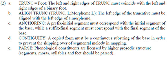 Yoruba hypocoristic names show basic processes of truncation and reduplication. In fact, a major area where truncation occurs in Yoruba is the area of hypocoristic name formation. According to Ola (1995), names in Yoruba may be regularly shortened to either VCV or CVCV - a binary (bimoraic or disyllabic) foot. Furthermore, as Ola (1995:195) observes, the shortened names always correspond to the leftmost segmental materials of the morpheme. For instance, a name such as kóláwolé may be realized as hold or wolé, while a name like foldmi may only be shortened as fold - other forms such as *lami or *mi are impossible. The latter form *mi is ruled out by the foot-based requirement, and although the former form *lami is not ruled out by this requirement, it may not be an optimal shortened form. Ola (1995) therefore proposes that truncation in Yoruba is also constrained by a leftmostness requirement, and it is this requirement that rules out *lami from being optimal. This leftmostness requirement is also what is responsible for the possibility of variants in truncated forms. Hence, Ola (1995) suggests some prosodic and leftmostness requirements for a truncation analysis which are presented below in (2).