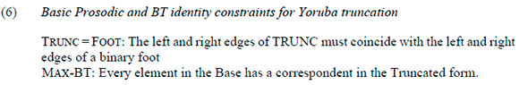 The constraints in (6) are necessary because Yoruba hypocoristic forms generally involve a process of structural reduction, but the reduced forms may not be smaller than a binary foot.