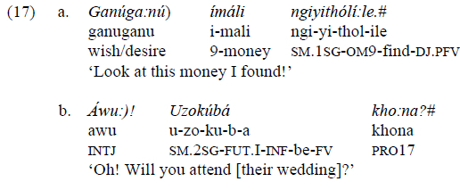 Xhosa and Zulu differ from isiNdebele with regards to questions and exclamative utterances. In these languages, yes/no questions do not have PUL at all (or much less than in declaratives), while in content and alternative questions there is more variation and optionality (Cope 1966:49; Khumalo 1981:36; Poulos and Msimang 1998:435; Jones 2011; Bloom-Ström 2022). Exclamative utterances, on the other hand, have PUL in Zulu (Cope 1966:49).