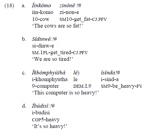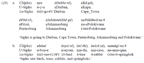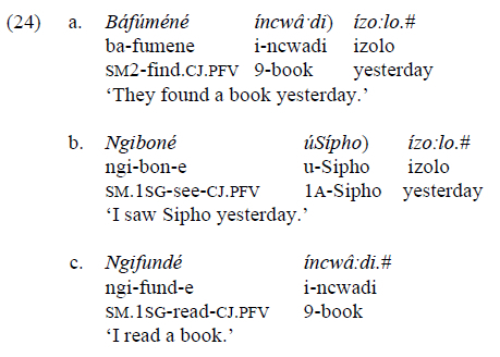 13 Halpert (2017:344) notes that in Zulu, the overt constituent following the conjoint form can be missing in some limited contexts, at least for some speakers. So far, such examples are not attested in our isiNdebele data. In cases where a syntactic complement cliticises to the verb (as with the question clitic =ni in Utjhísâ:ni? 'What are you burning?'), the conjoint form is used and the final verb syllable (PU of the phrase) is lengthened. Thanks to an anonymous reviewer for pointing out this common exception to the rule described above.