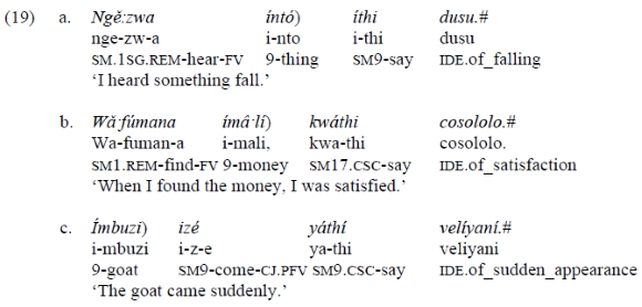 Ideophones have short penultimate vowels even in utterance-final position (19a,b). Some ideophones also have an utterance-final H tone, which is not usually allowed (19c), and some have a long final vowel (19d). The full range of prosodic features of ideophones needs more research.