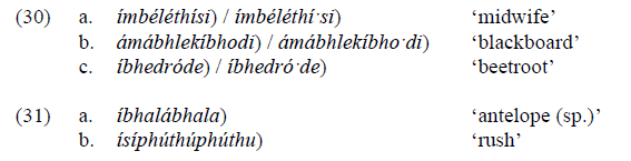 Penultimate lengthening interacts with tone realisation. IsiNdebele differs from other Nguni languages in that tone distinctions are often realized on the penultimate and final syllables, whereas in the other Nguni languages, tone distinctions are typically realized one syllable earlier, that is, on the antepenultimate and penultimate syllables (Aunio et al. 2019). At least in fully lengthened forms, the penult has an additional tone-bearing unit, making room for different, often more complex, surface tone patterns (Hyman 2013:311); the lengthening itself is induced by phrase and/or utterance boundaries, which also condition tone realisations. In addition, tonal realisations are conditioned by depressor consonants. The interaction of tone, length, syntactic position, and depressor consonants is exemplified below with bisyllabic nominal stems; the same processes also apply to other parts of speech.