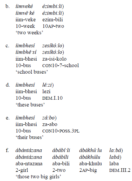 For noun phrases, determining phonological phrase boundaries using syntactic criteria is less straightforward than for verb phrases. This is especially the case in noun-modifier phrases where the modifier is an adjective, a numeral, or a possessive noun. In these phrases, PUL may optionally appear on the phrase-medial noun depending on the speech rate, as in (33a-c). In contrast, Noun Phrases in which the modifier is a demonstrative or a possessive pronoun mostly allow lengthening only on the modifier, as in (33d,e). Similar PUL patterns have been reported in Xhosa and Zimbabwean Ndebele (Lanham 1960:133), and also in PUL languages beyond the S languages, such as Makonde (P23, ISO 639-3 kde; Kraal 2005; Manus 2018) and Ngangela (K12b, ISO 639-3 nba; Maniacky 2002, cited in Hyman 2013). In sequences of modifiers, the non-final modifiers optionally receive penultimate lengthening, as in (33f).