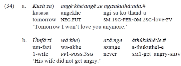 Some phrase-medial words are nevertheless frequently lengthened (with medium or even full lengthening). It is our impression that these words are likely to be emphasised, and that this emphasis may be the source of the lengthening. These include the preverbal negative auxiliaries angé:khe/angê:ze 'won't, will never' (34a) and ază.nge/akhá:nge 'didn't, has/have never' (34b,c). IsiNdebele, like other Nguni languages, has many preverbal auxiliaries, and their lengthening properties are an important topic for future research.