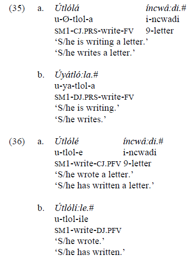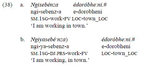 Penultimate lengthening is related to phrasing, and an important factor in syntactic and phonological phrasing in isiNdebele is the conjoint/disjoint distinction. Nguni languages are well-known for segmentally distinguishing, in certain tense-aspect configurations, verbs that share vP constituency with the following sentence element (including, for example, objects and adverbials) and those that do not (e.g. Buell 2006; Zeller, Zerbian and Cook 2017; see van der Wal and Hyman 2017 for a general overview of the phenomenon and numerous language-specific discussions regarding Nguni and other languages). Verb forms of the former type are labelled "conjoint" (35a, 36a) and the latter "disjoint" (35b, 36b). (Non-)constituency is closely related to focus in many instances.12