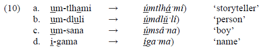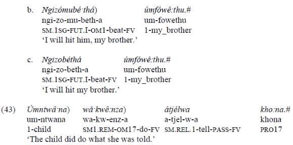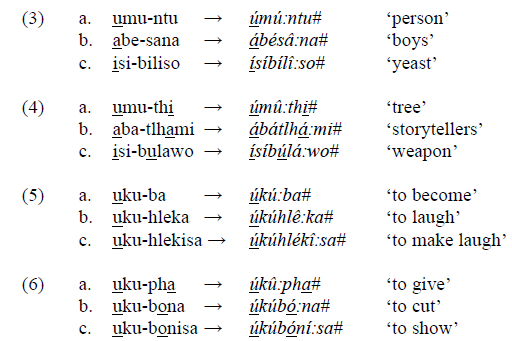 3 Note that underlying tones are not marked in Section 3. This is because analysis of the isiNdebele tone system is still underway, and the more naturalistic examples in Section 3 onward pose many questions as to the morphemes contributing H tones.
