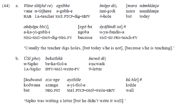 17 Square brackets are used in this subsection to mark the subordinate clauses. We remain agnostic as to whether mara 'but' (44a) and kodwana 'but' (44b) introduce coordinate or subordinate clauses.
