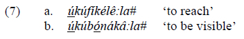 Prominence of the penultimate syllable in a word, phrase, or utterance is common across Bantu languages. Probably the most frequent realisation of penultimate prominence is through lengthening of the syllable, especially through the insertion of a tone-bearing mora; this lengthening often affects tonal patterns (Hyman 2013:310-311). Penultimate lengthening is pervasive in many (perhaps most) Eastern and Southern Bantu languages in which the Proto-Bantu contrast in vowel length has been lost (Hyman 2013), including the Bantu languages spoken in South Africa. Example (1) shows lengthening and tone patterns for lexically toneless isiNdebele verbal infinitive forms when pronounced in isolation. With monosyllabic verb stems, the last vowel of the infinitive prefix uku- is lengthened (1a); with other verb stems (1b-d), the final root vowel (before the final vowel -a) is lengthened.1