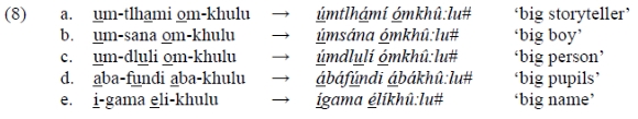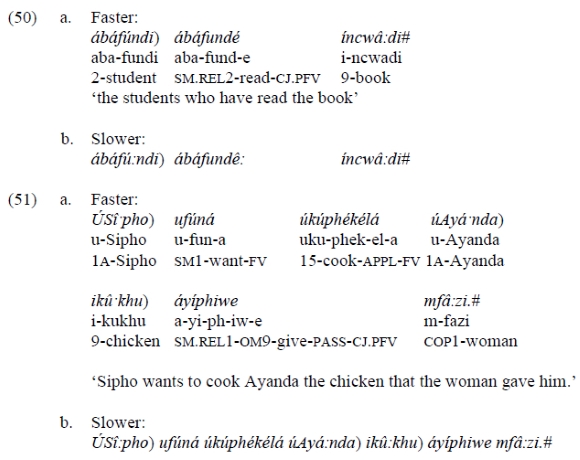 19 Jokweni notes that "the process of lengthening the penultimate vowel applies at the right edge of a Phonological Phrase [...] We give a variety of phrases where the Phonological Phrase boundary exists utterance-medially and utterance-finally" (Jokweni 1995:128-129; note that Jokweni only presents two lengths, long and short, despite describing two different lengthening contexts). Jokweni states that utterance-medial phrase-final position is NOT subject to word-final H deletion (normally operating within phonological phrases), indicating that there are three syntactic positions that condition tone realisations (Jokweni 1995:128-129).