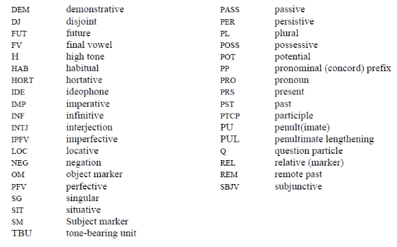 When citing isiNdebele data in this article, we follow - with a few additions - the orthographic conventions of isiNdebele (PanSALB 2008; see Mahlangu 2016 for a history of isiNdebele orthography and additional references). As penultimate lengthening and other length distinctions are not marked in the isiNdebele orthography, lengthening is indicated in the examples with the following IPA symbols: (:) for full lengthening, and (·) for partial lengthening. In addition, our notation marks tone. Lexical and grammatical underlying H tones are marked by underlining the vowel contributing the H tone (a).3 Surface H tones are marked with an accent (á), a circumflex (â) indicates a falling tone pattern on a lengthened vowel, a caron (ă) marks rising tones, and L tones are left unmarked (a). The details of the isiNdebele tone system are still under investigation, and the tone marking in this paper therefore reflects our present understanding of the system. The right edges of phrase boundaries, syntactic and/or phonological, are indicated with a right parenthesis, and hash symbols (#) mark the ends of utterances.