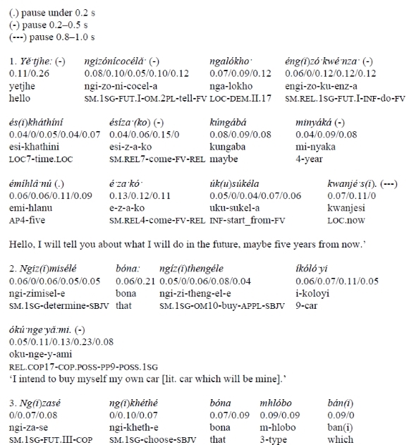 This is a sample isiNdebele text with vowel lengths marked in seconds on the row below the text line. All length measures in this text are approximate as segmentation is challenging in many contexts. While PUL is always relative at least to some extent, we have marked mid-length (·) in the text whenever the realised length is between 0.11 and 0.19 seconds. Longer PUL (>0.20 s) is marked as full lengthening (:). Vowels not realised at all are in parentheses. Surface tones are marked.