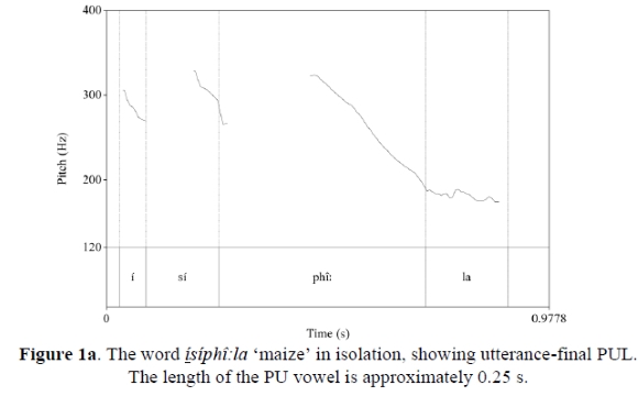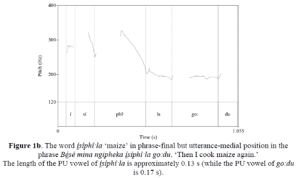 As a general rule, PUL appears regularly on phrase-final words and almost always on utterance-final words. As noted above, utterance-final words are fully lengthened while utterance-medial but phrase-final words generally receive mid-length. Example (11) repeats the phrases that appear in Figures 1a-b with the word ísíphî:la 'maize' in phrase-final position: full PUL utterance-finally in (11a) and medium PUL utterance-medially in (11b).9