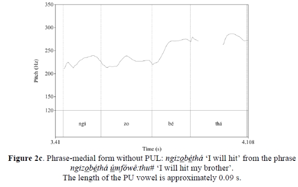 Figures 2a-c show the verb -betha 'hit' in the three positions with their corresponding lengths, as recorded by a single speaker (different from the speaker in Figures 1a-c). In Figure 2a, the future form ngizómubé:tha 'I will hit her/him' is utterance-final and shows full lengthening of the PU vowel. In Figure 2b, the verb ngizómubé:tha 'I will hit her/him' is phrase-final but followed by a postposed object within the same utterance (ngizómubé:tha úmfówê:thu 'I will hit him, my brother' ; see Section 3.1.2), resulting in medium lengthening. In Figure 2c, the verb ngizobéthá 'I will hit' is phrase-medial and has a short PU vowel (ngizobéthá úmfówê.thu 'I will hit my brother').