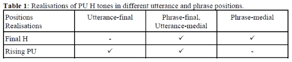 The realisations of lexical H tones on the penultimate and the final vowel in different utterance positions are summarized in Table 1. As the combinations of values for the three positions are different, tonal realisations can be used as a diagnostic for determining the phrase boundaries. However, given that tones contributed by pre-APU syllables do not target the final at all, these diagnostics do not work for longer words with lexical H tone or for lexically toneless words, even if the latter are short and have a H tone contributed by an augment.8