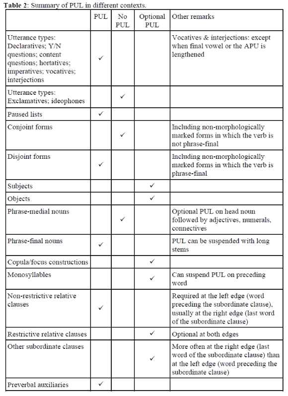 As shown above, the main criterion that determines whether a word has PUL is its position in the phrase: Phrase-final words have PUL while phrase-medial do not. However, as we have seen, phrase boundaries cannot be determined based on PUL alone, as phrase boundaries do not always induce PUL and, on the other hand, PUL can be induced by factors other than syntactic phrase boundaries. For example, vocatives and exclamatives do not have PUL even in utterance-final position, while preverbal auxiliaries often have PUL. Also, PUL is seemingly optional in many contexts in isiNdebele, but further studies may reveal conditioning factors that have not been taken into account in this study.