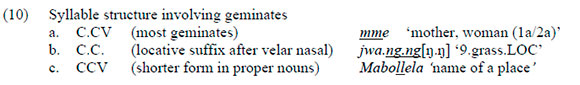The closely related Tswana language also has geminate nasals and liquids, including the trilled [r] (Bennett et al. 2016:239) which is not found as geminate in Sesotho. Bennett et al. (2016) note that /ll/ is rare in Tswana, but this is not the case in Sesotho. Coetzee (2001) explains that geminates in Tswana have a syllable structure of C.CV and the data we present here matches this pattern with the exception of the locative suffix which always forms its own syllable as in jwa.ng.ng[n.n]4 (9.grass.LOC) 'in/at/on (the) grass'.