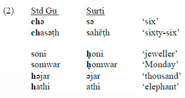 I start by describing the changes evident in Surti, the dialect spoken by millions in and around the district of Surat (see Map 1). This is essentially the form of Gujarati used in Cape Town and was thus the beginning point of the enquiry that led to the uncovering of a chain shift in the matrilectal Gujarati dialects more generally. The three segments of the shift evinced by Surti are shown below in (2): ch -> s; s -> h; h -> 0. Illustrations are from word-initial position for ease of exposition; some allophonic variation in other positions would necessitate a more detailed set of comparisons.