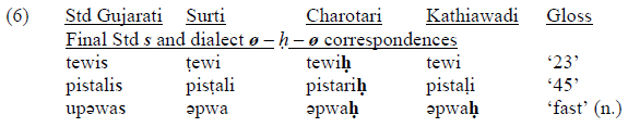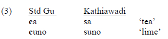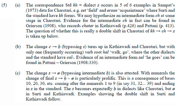 Chain shifts are not generally susceptible to 'overshoot' since the distance between phonemes is usually retained after a shift. In this regard Martinet (1955:4) speaks of a "margin of security" within the "field of dispersion" (see Labov 1994:218). However, the Gujarati dialect data does give quite a few counter-examples, in which one dialect exhibits a double shift compared to the standard and (sometimes) to the other dialects. The overall schema k, kh -> c, ch -> s -> h, & h -> 0 gives five possibilities for double shifts: (a): k, kh -> s; (b) c, ch -> h; and (c) s -> 0. Of these, three are attested: kh -> s, c -> h and s -> 0 (but not k -> s or ch -> h). The double shifts are given in (5) and illustrated in (6).