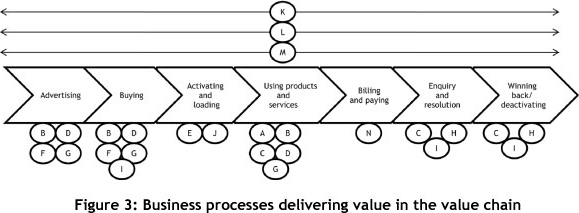 According to Botha et al. [5], it is important to identify and document all the business processes in the organisation that have an impact, direct or indirect, on customer experience in a selected market segment. A value chain analysis may be done to identify a list of high level business processes for Company A. Chase et al. [8] suggest the value chain as a structure to capture the linkage of organisational activities that create value for the customer and profit for the firm. Value chain analysis was chosen as the preferred technique for Stage Two of the ECEF, as the value chain may be useful to identify all the key business processes from Company A that may deliver value to the customer. Figure 2 shows a typical value chain for a company like Company A. Data for value chain analysis are obtained from existing sources within Company A.