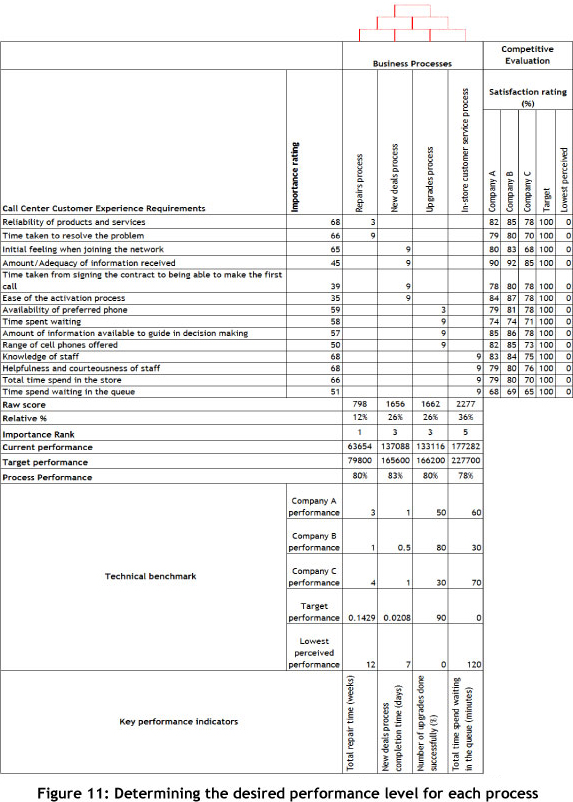 In this stage, the desired performance level from a customer perspective should be estimated prior to attempting process improvements. Botha et al. [5] concluded from the literature that QFD is a suitable method to estimate the desired performance level. In this stage the desired performance level is estimated by examining the extent to which the performance of similar services in the market satisfies customer needs. The desired performance level is thus determined through benchmarking.