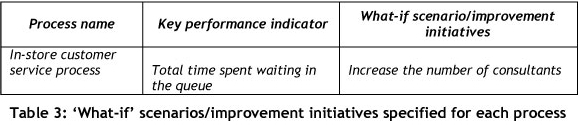 In this stage, improvement initiatives in the form of 'what-if' scenarios are defined for the in-store customer service process. The 'what-if' scenario is specified with the aim of improving the performance of the process against the KPI chosen for the process, and is shown in Table 3. The improvement in performance also then has an impact on the satisfaction rating of each associated requirement. The 'what-if' scenario must be tested with simulation models to determine the extent to which the process may be improved. Various 'what-if' scenarios can be identified and tested to determine the best possible improvement initiative for the process. The different improvement initiatives may also be analysed to determine the cost associated with each alternative to help choose the best initiative. For the purpose of the partial validation, only one 'what-if' scenario for the process is determined and tested through simulation. The costing analysis of the improvement initiatives does not form part of the partial validation. The following improvement initiative may contribute to higher customer satisfaction.