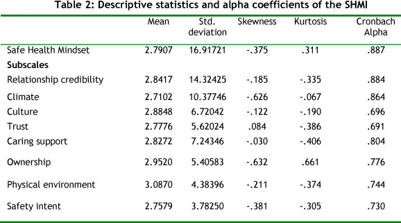 The p=.200, p>0.05 result of the Kolmogorov-Smirnov test was non-significant, and consequently did not deviate from normality [32]. The normal frequency distribution facilitates the application of parametric tests [33]. No factor analysis could be performed because of the small sample size. The researchers therefore decided to use the theoretical scale and sub-scales of the SHMI as identified by Schutte [6]. The descriptive statistics and reliabilities of the Safe Health Mindset factor, as well as the sub-scales, are reported in Table 2.