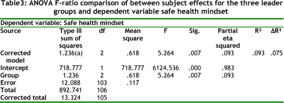 Next, an Anova was performed to assess the relationship between the three leadership levels and the combined variable of safe health mindset. The results are shown in Table 3.