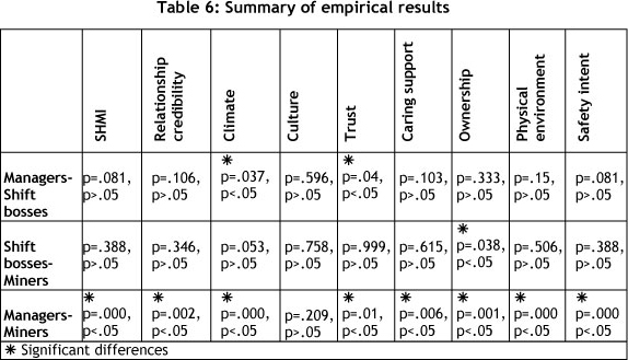 Table 6 shows that there are statistically significant differences between managers and shift bosses for climate and trust. Shift bosses and miners showed statically significant differences for caring support. Managers and miners showed statistically significant differences on all dimensions except culture.