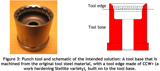 The third case study is an ongoing activity that focuses on the prolonged lifetime of a punch tool. The punch is used for making holes in aluminium profiles for the automotive industry. Critical issues are the abrasion and wear on the tool edge, followed by crack formation in the cup. The current material in the punch is tool steel: H13 or DIN W.nr.1.2344, HRc 52, (corresponding to Orvar Supreme [15]).